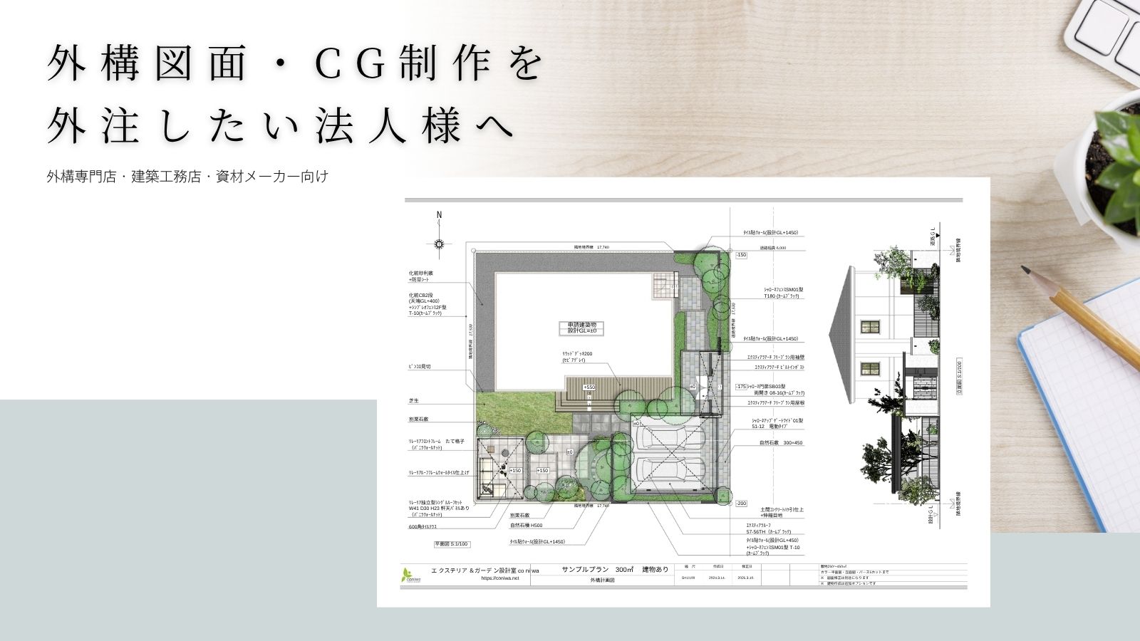 エクステリア&ガーデン設計室coniwaでは、外構専門店・建築会社・資材メーカー向けに、外構図面作成・CG制作・提案用ビジュアル制作を行っています。 繁忙期のスポット依頼から、継続的な外注先としてのご相談まで対応しています。