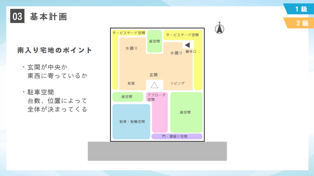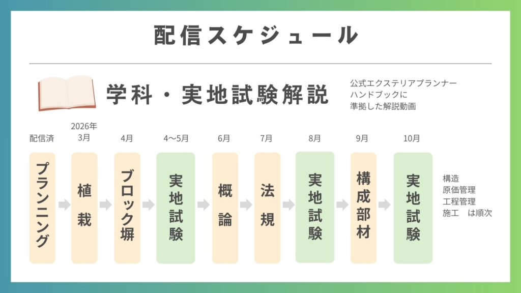 学科はプランニング、植栽、ブロック塀、概論、法規、エクステリアの構成部材の順に公開します。
